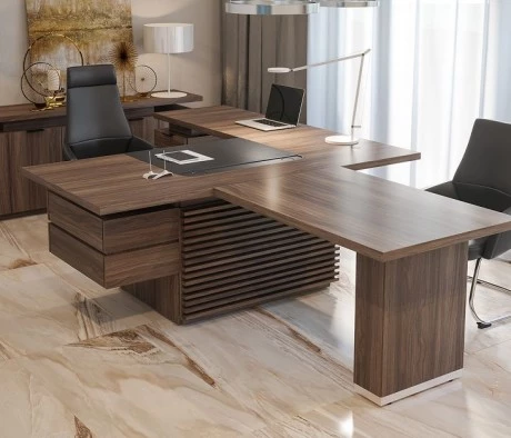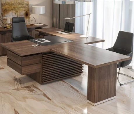Мебель для кабинета руководителя была выбрана в более строгом стиле и темных тонах, что создает атмосферу делового взаимодействия. Кресло руководителя из натуральной кожи черного цвета является элегантным и стильным элементом интерьера, а стол руководителя с вставками из кожи подчеркивает его авторитетность и статус.